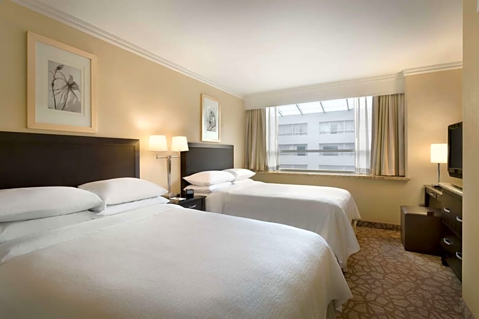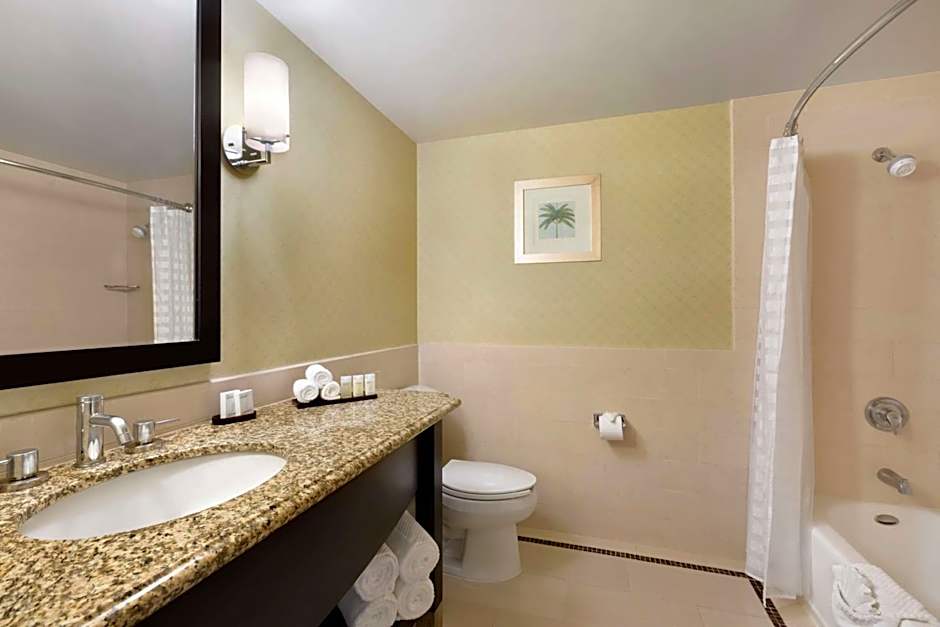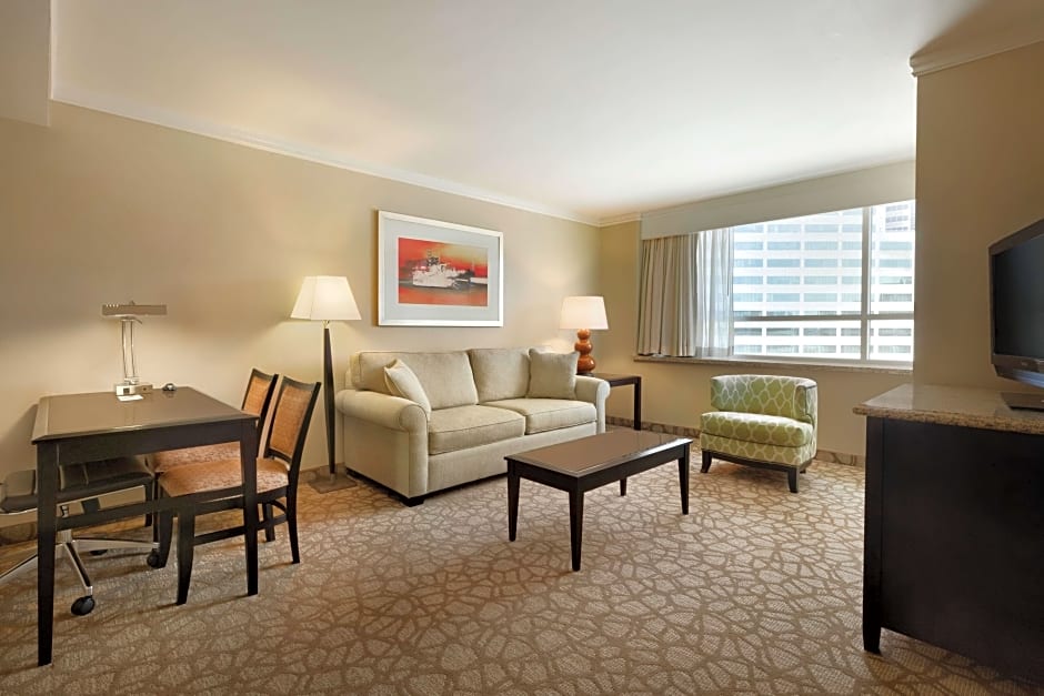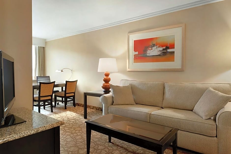 Hotel atrium view, living area, refrigerator, microwave, sofa bed, work area, two TVs, WiFi Relax in this two-room suite that overlooks the hotel atrium, waterfall and koi pond. The private bedroom includes 2 double beds and a flat-screen TV. The separate living room has a 32-inch HDTV and a seating area with parlor chair and a full-sized sleeper sofa. Work at the desk with ergonomic chair and keep in touch with WiFi. The bathroom has marble vanity, spacious shower and luxurious bath products. Other amenities include refrigerator, microwave and coffeemaker.