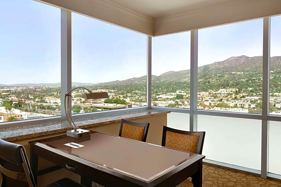 Mountain views, living area, refrigerator, microwave, sofa bed, work area, two TVs, WiFi Relax in this two-room suite that overlooks the Glendale skyline and San Gabriel Mountains. The private bedroom includes one king-sized bed and a flat-screen TV. The separate living room has a 32-inch HDTV and a seating area with parlor chair and a full-sized sleeper sofa. Work at the desk with ergonomic chair and keep in touch with WiFi. The bathroom has marble vanity, spacious shower and luxurious bath products. Other amenities include refrigerator, microwave and coffeemaker.