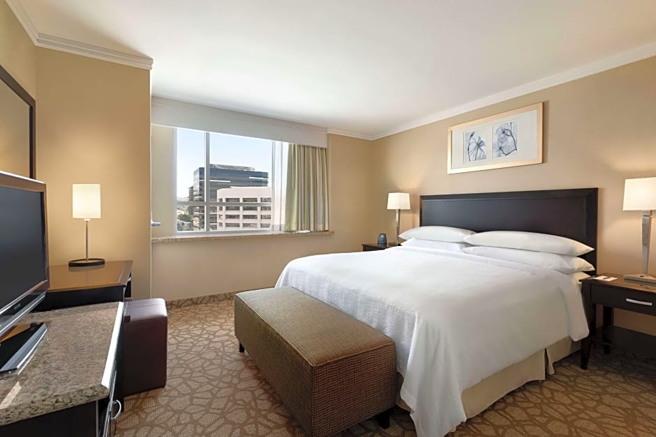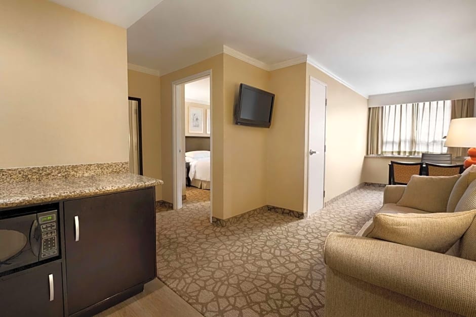 City view, corner room, living area, refrigerator, microwave, sofa bed, two 32-inch TVs, WiFi Settle into our spacious corner suite and admire the downtown Glendale skyline and panoramic views. The private bedroom includes one king-sized bed and a flat-screen TV. The separate living room has a 32-inch HDTV and a seating area with parlor chair and a full-sized sleeper sofa. Work at the desk with ergonomic chair and keep in touch with WiFi. The bathroom has marble vanity, spacious shower and luxurious bath products. Other amenities include refrigerator, microwave and coffeemaker.